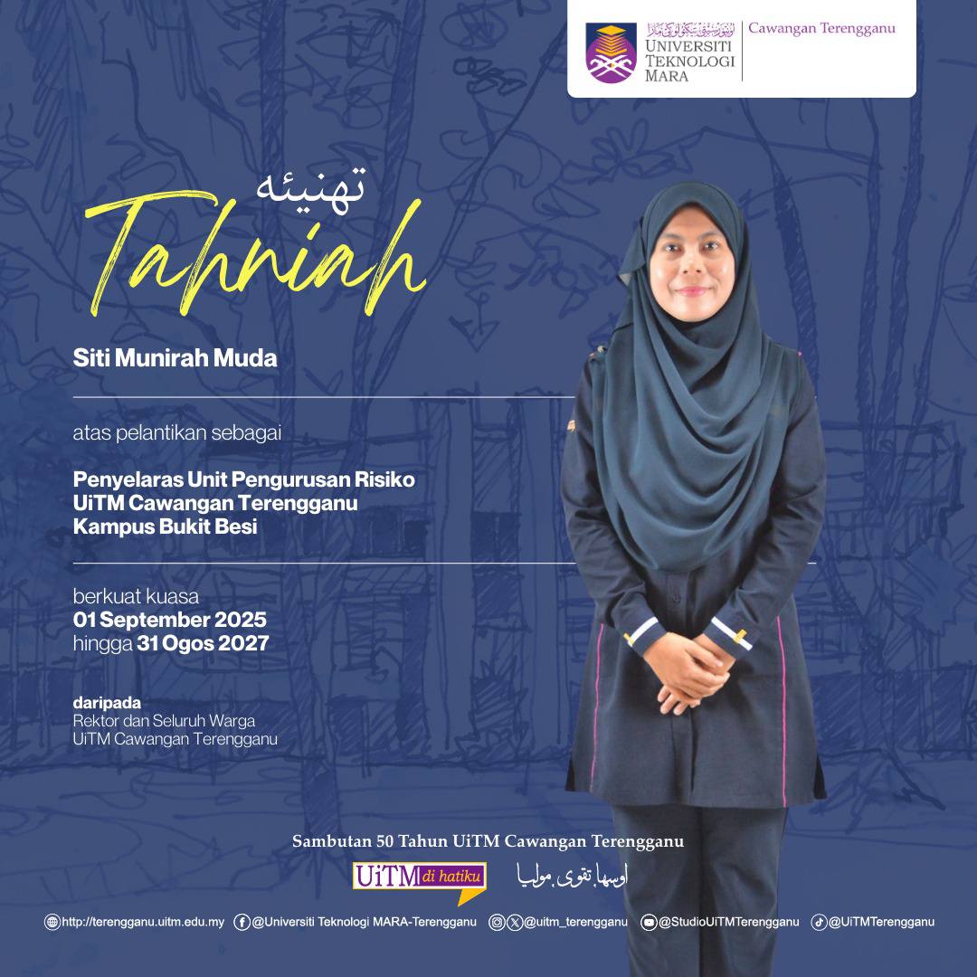 22 Jan,2025 Administrator Uncategorised Hits: 346 Tahniah diucapkan kepada Puan Siti Munirah atas Perlantikan Unit Pengurusan Risiko