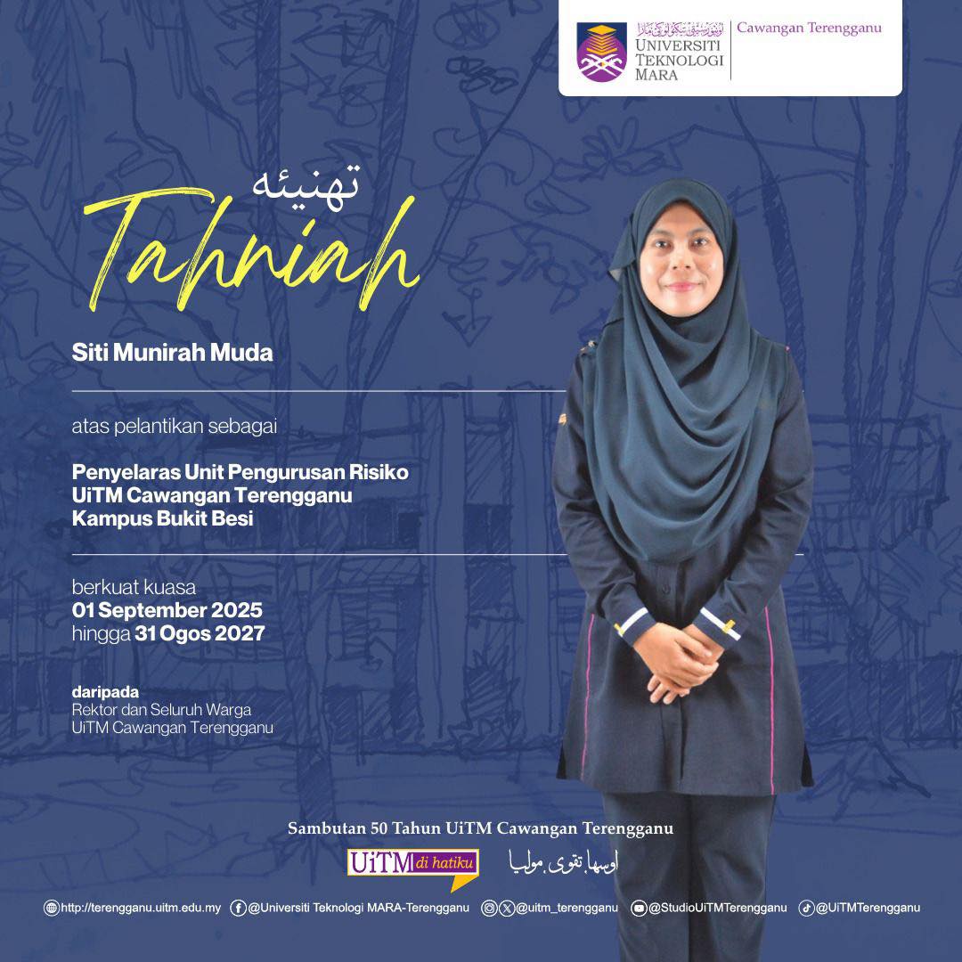 09 Sep,2025 Administrator Campus News Hits: 397 Congratulations to Siti Munirah binti Muda on her appointment as the Coordinator of the UiTM Risk Management Unit, Terengganu Branch, Bukit Besi Campus Print Prev Next