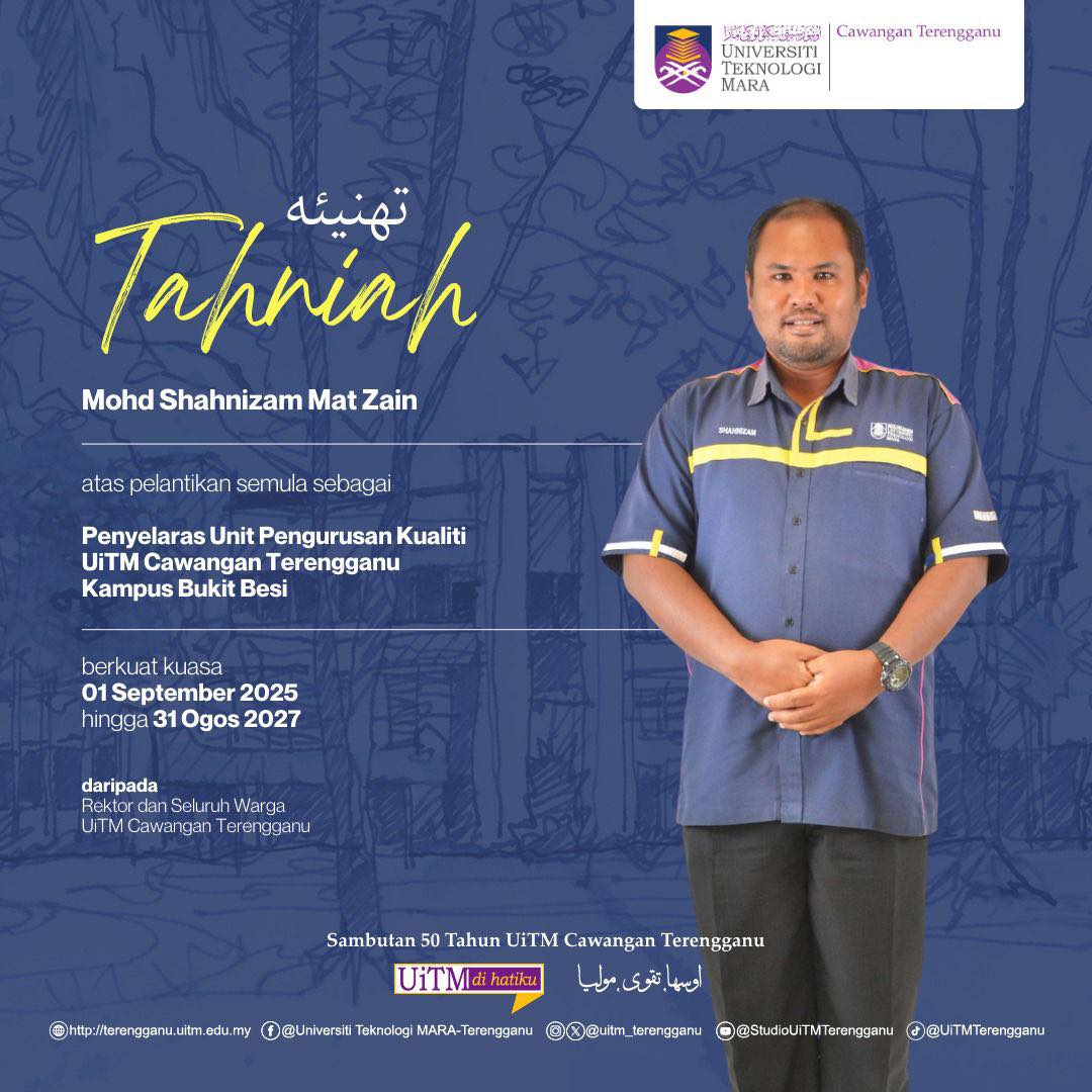 07 Sep,2025 Administrator Campus News Hits: 352 Congratulations to Mohd Shahnizam bin Mat Zain on his reappointment as Coordinator of the UiTM Quality Management Unit, Terengganu Branch, Bukit Besi Campus. Print Prev Next