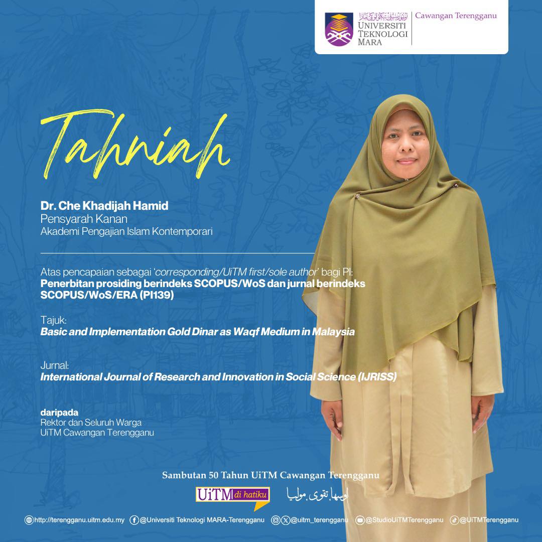 06 Nov,2025 Administrator Campus News Hits: 35 Congratulations to Dr. Che Khadijah Hamid for her achievement as 'Corresponding / UiTM First / Sole Author' for PI: Publication of SCOPUS / WoS indexed proceedings and SCOPUS / WoS / ERA indexed journals (PI139).