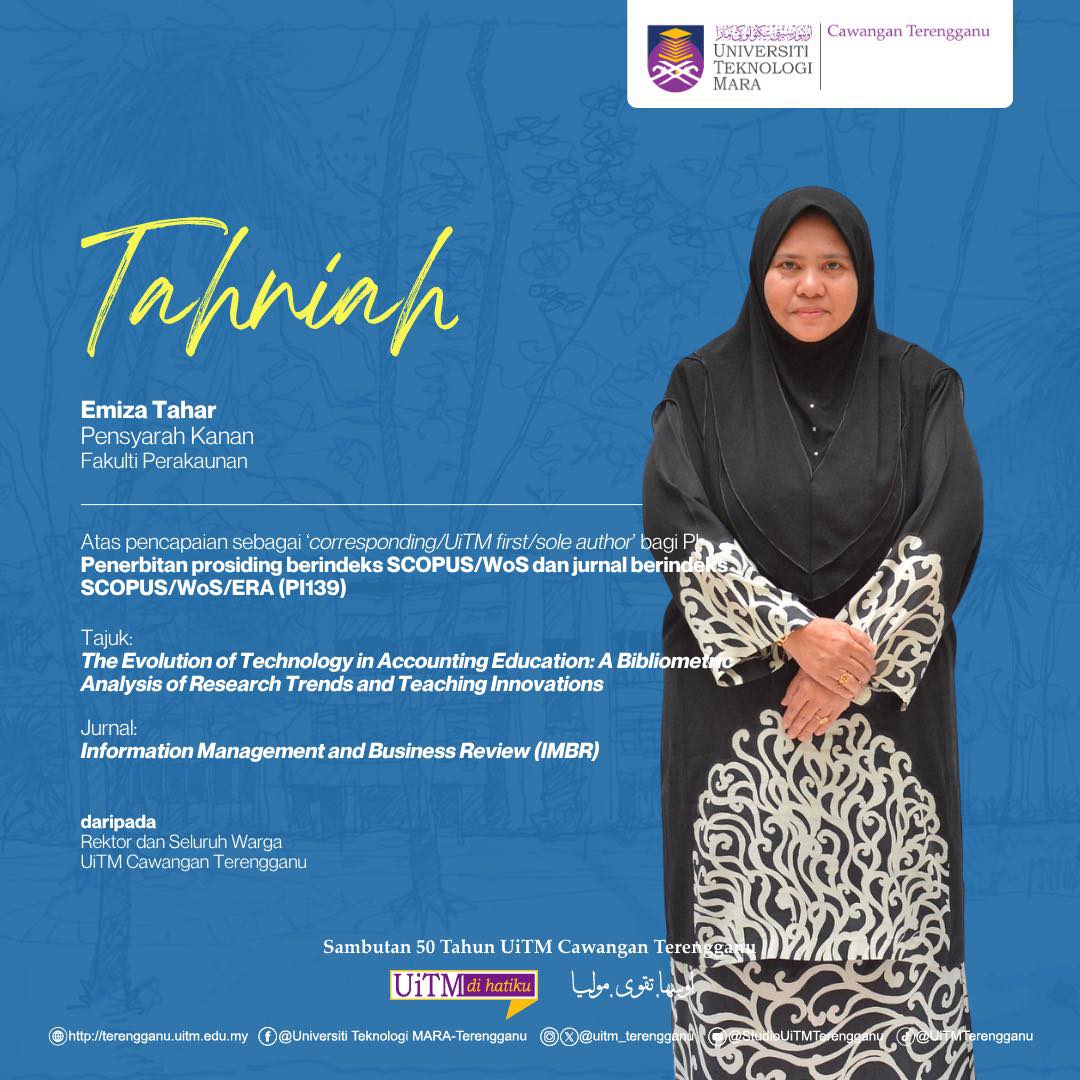 06 Nov,2025 Administrator Campus News Hits: 30 Congratulations to Emiza Tahar on her achievement as ‘Corresponding / UiTM First / Sole Author’ for PI: Publication of SCOPUS / WoS indexed proceedings and SCOPUS / WoS / ERA indexed journals (PI139)
