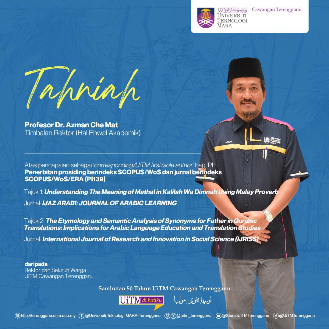 06 Nov,2025 Administrator Campus News Hits: 41 Congratulations to Prof. Dr. Azman Che Mat on his achievement as 'Corresponding / UiTM First / Sole Author' for PI: Publication of SCOPUS / WoS indexed proceedings and SCOPUS / WoS / ERA indexed journals (PI139).