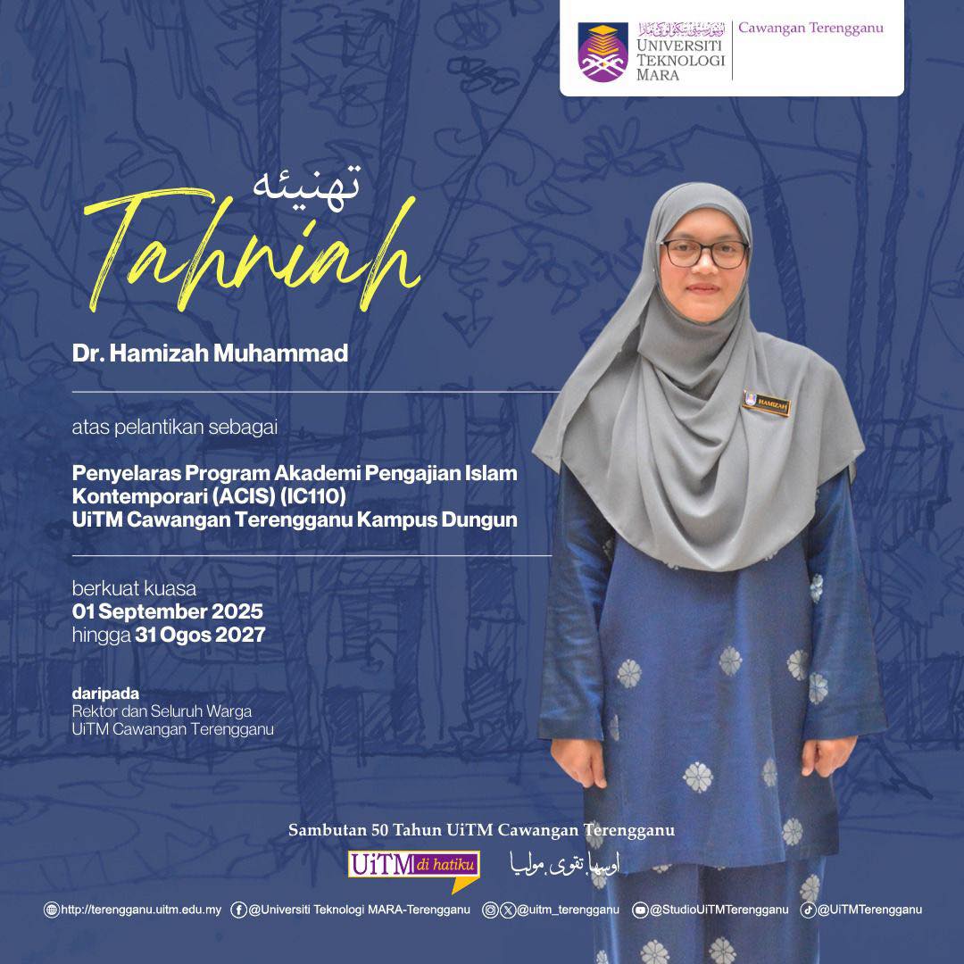 08 Sep,2025 Administrator Berita Kampus Jumlah paparan: 480 ahniah Dr. Hamizah binti Muhammad atas pelantikan sebagai Penyelaras Program Akademi Pengajian Islam Kontemporari (ACIS) (IC110) UiTM Cawangan Terengganu Kampus Dungun Cetak Seterusnya Seterusnya