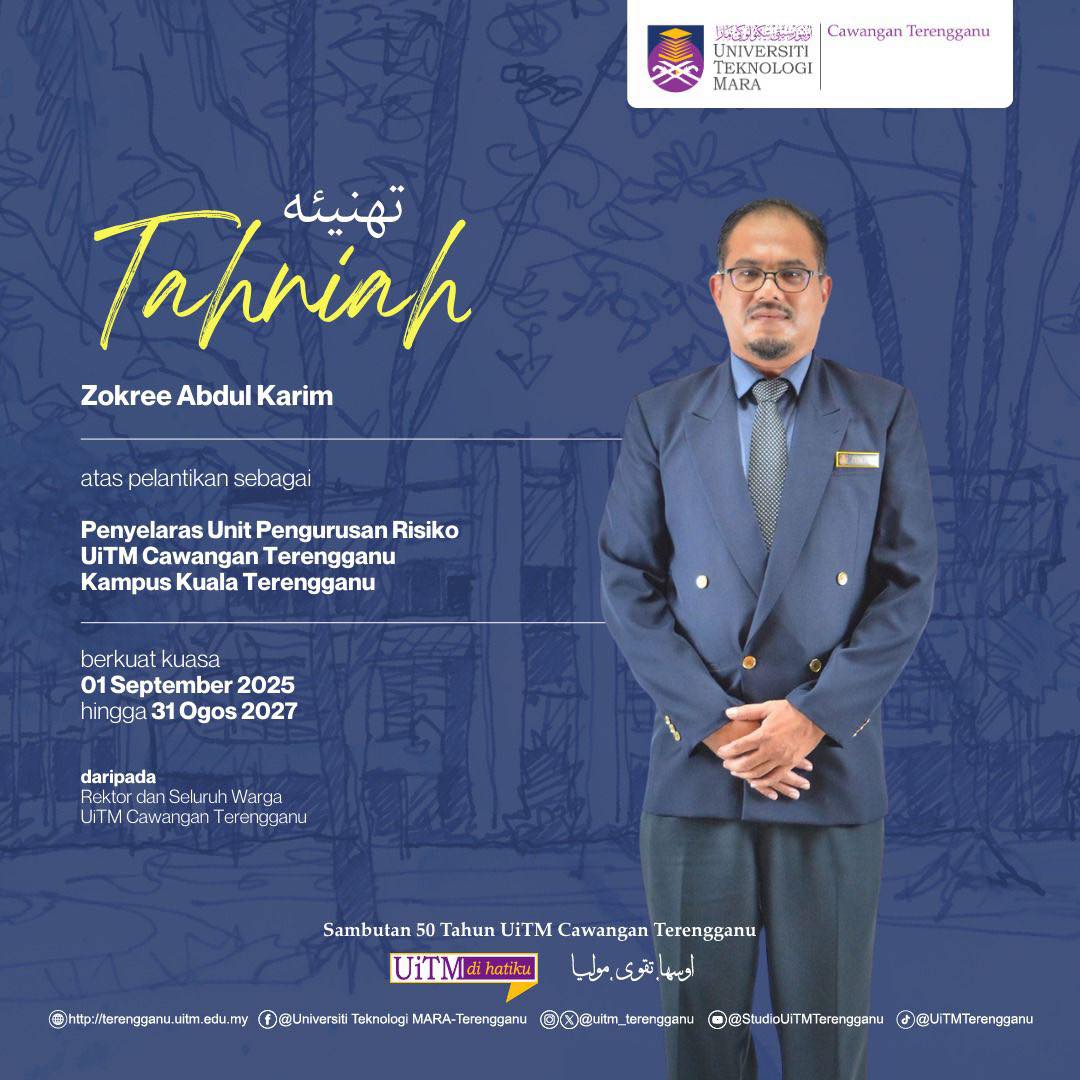 08 Sep,2025 Administrator Berita Kampus Jumlah paparan: 492 Tahniah Zokree bin Abdul Karim atas pelantikan sebagai Penyelaras Unit Pengurusan Risiko UiTM Cawangan Terengganu Kampus Kuala Terengganu Cetak Seterusnya Seterusnya