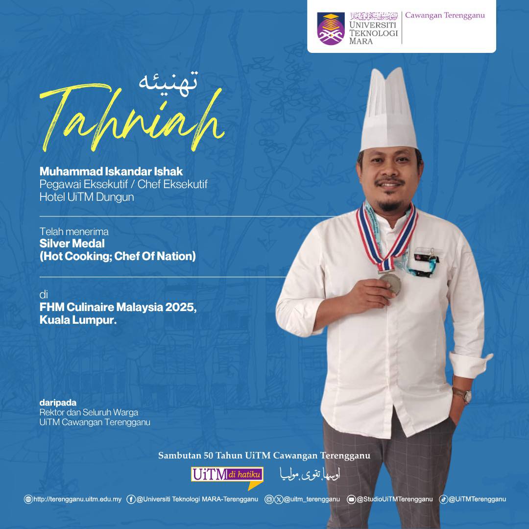 05 Okt,2025 Administrator Berita Kampus Jumlah paparan: 3 Tahniah Muhammad Iskandar bin Ishak atas pencapaian menerima Silver Medal (Hot Cooking; Chef Of Nation) di FHM Culinaire Malaysia 2025, Kuala Lumpur. Cetak Baca selanjutnya: Tahniah Muhammad Iskandar bin Ishak atas pencapaian menerima Silver Medal (Hot Cooking; Chef Of...