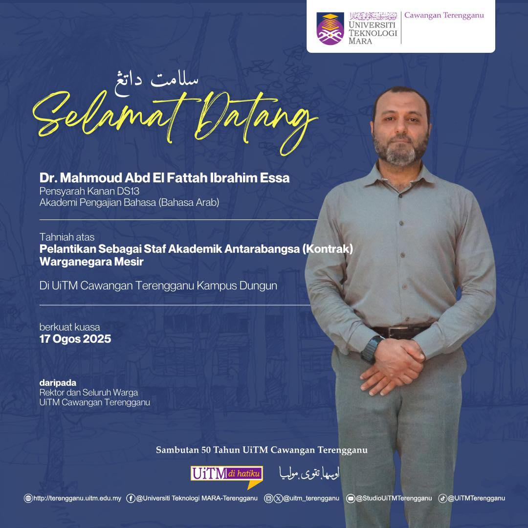 04 Sep,2025 Administrator Berita Kampus Jumlah paparan: 405 Selamat Datang dan tahniah Dr. Mahmoud Abd El Fattah Ibrahim Essa atas Pelantikan Sebagai Staf Akademik Antarabangsa (Kontrak) Warganegara Mesir Di UiTM Cawangan Terengganu Kampus Dungun Cetak Seterusnya Seterusnya