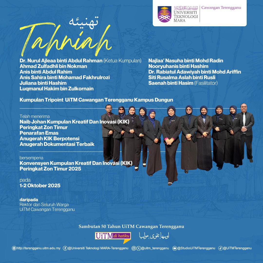 Tahniah TRIPOINT atas pencapaian menerima Naib Johan Kumpulan Kreatif Dan Inovasi (KIK) Peringkat Zon Timur, Penarafan Emas, Anugerah KIK Berpotensi dan Anugerah Dokumentasi Terbaik sempena Konvensyen Kumpulan Kreatiff Dan Inovasi (KIK) Peringkat Zon Tim